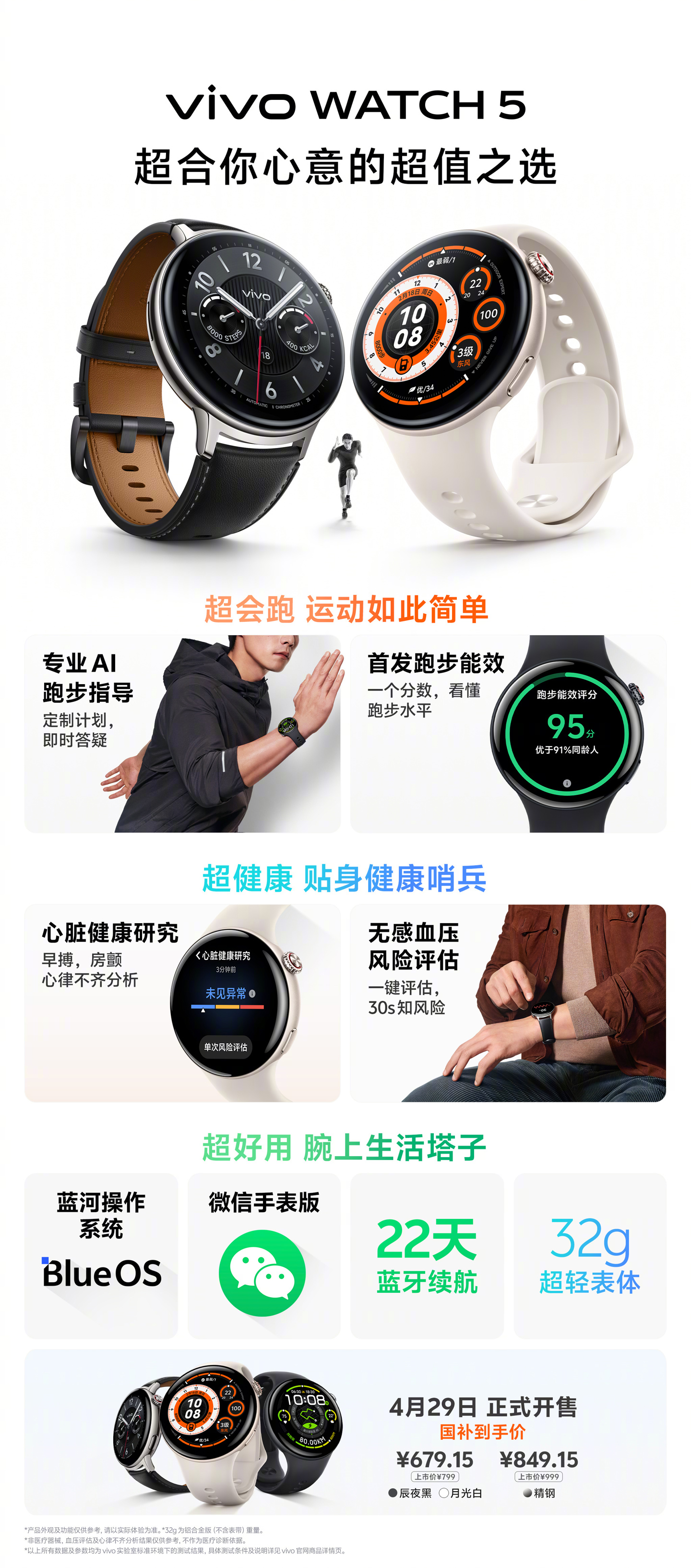 vivo WATCH 5 配备专业 AI 跑步指导,新手老手都能上手;血压健康研究,30s 快速风险评估;心脏健康研究,心律不齐分析;22 天蓝牙续航,电量三周在线;全新蓝河操作系统,蓝心小 V AI 助理。
