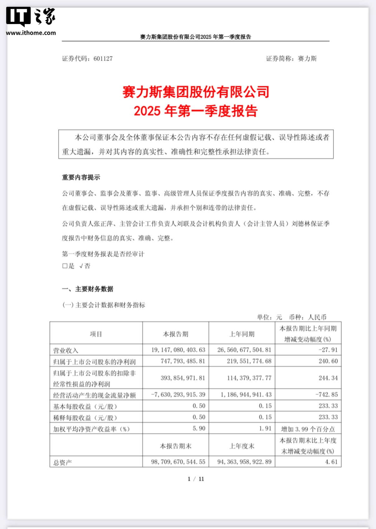 IT之家 4 月 29 日消息,赛力斯发布 2025 年一季报。报告显示,一季度赛力斯实现营业收入 191.47 亿元,净利润 7.48 亿元同比增长 240.6%。