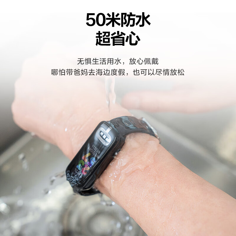 这款智能手环提供双色可选,其配备一块 AMOLED 面板(具体规格未公布),整体重量 27 克,支持 50 米防水,配有医用级硅胶材质表带。