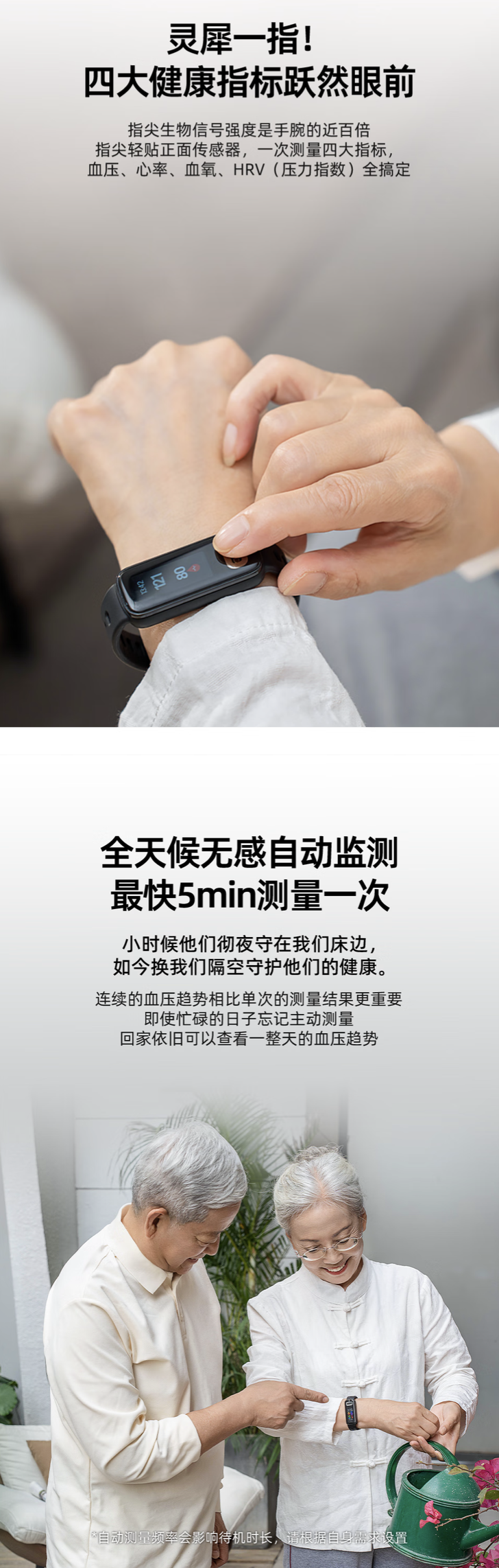 官方称这款智能手环采用溅射沉积工艺血压算法,支持一次测量血压、心率、血氧、HRV(压力指数)信息。同时手环支持全天候无感自动检测,最快 5 分钟测量一次血压,同时支持生成血压趋势图表。