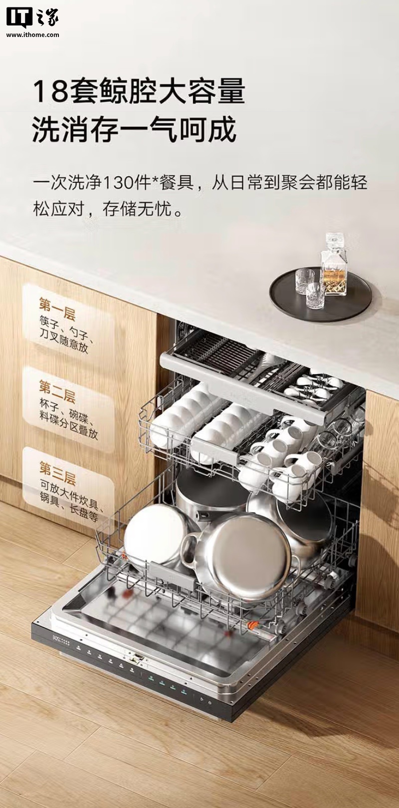 据介绍,该洗碗机具有 18 套“鲸腔容量”,一次可洗净 130 件餐具。同时搭载了“光学浊度传感器和 AI 智能算法”,号称 2 秒判别脏污程度,自动匹配最佳洗涤程序,智能调整洗涤时间和用水量。新品内置 450mL 大容量储液仓,一次添加可持续使用 3 周。