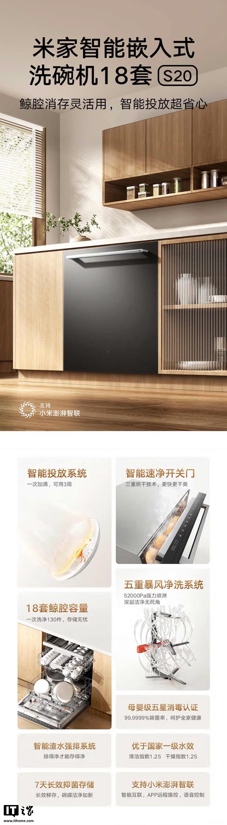 IT之家 4 月 29 日消息,小米米家智能嵌入式洗碗机 18 套 S20 将于今晚 8 点在京东开售,该洗碗机洗碗机标准价 4699 元,首发价 4299 元,国补价 3439.2 元起。