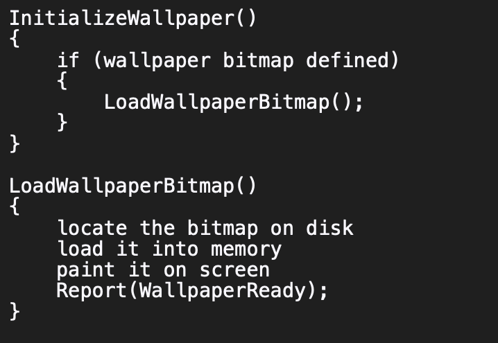 出问题的地方在于 Report (WallpaperReady) 调用放在 LoadWallpaperBitmap 函数中,当壁纸设置后,该代码才会回报“就绪”信号;如果用户使用的是纯色背景而不是壁纸,LoadWallpaperBitmap 代码将被完全跳过,这意味着 Report (WallpaperReady) 代码将不会回报“就绪”信号,系统只能苦等 30 秒后超时。