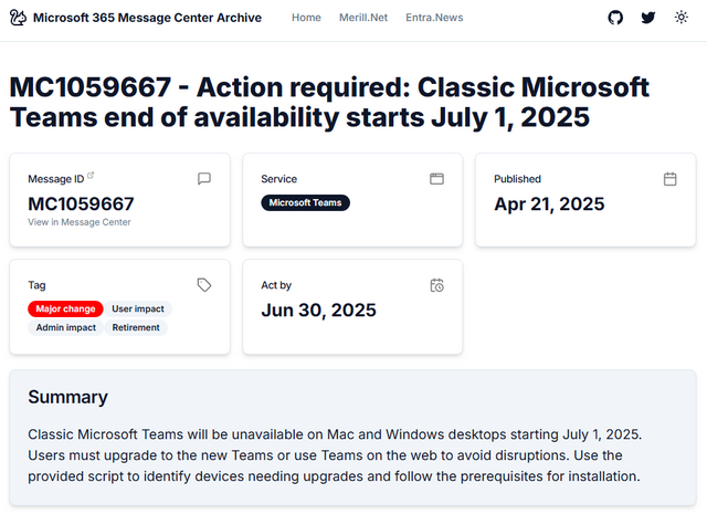 IT之家 4 月 30 日消息,微软昨日(4 月 29 日)发布 MC1059667 公告,宣布自 2025 年 7 月 1 日开始,在 Windows 10、Windows 11、macOS 系统上,彻底停用经典版 Microsoft Teams Classic(1.0)客户端。