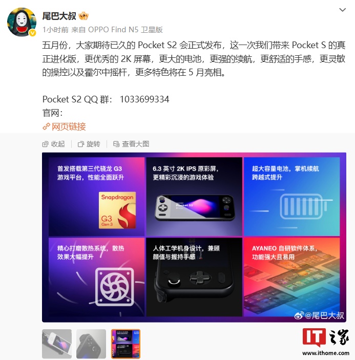 IT之家 4 月 30 日消息,深圳市攻氪科技有限公司 CEO @尾巴大叔 今日宣布,AYANEO Pocket S2 全新旗舰安卓掌机将于 5 月发布,新机将搭载高通第三代骁龙 G3 平台、配备 2K 屏幕。