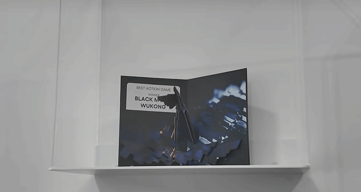 《黑神话:悟空》艺术展于本月早些时候在杭州中国美术学院美术馆开展。到场游客发现,游戏科学在其展台上陈列了本作迄今以来获得各种大奖的奖杯,而 TGA 奖杯区域仅放了一张纸卡代替。