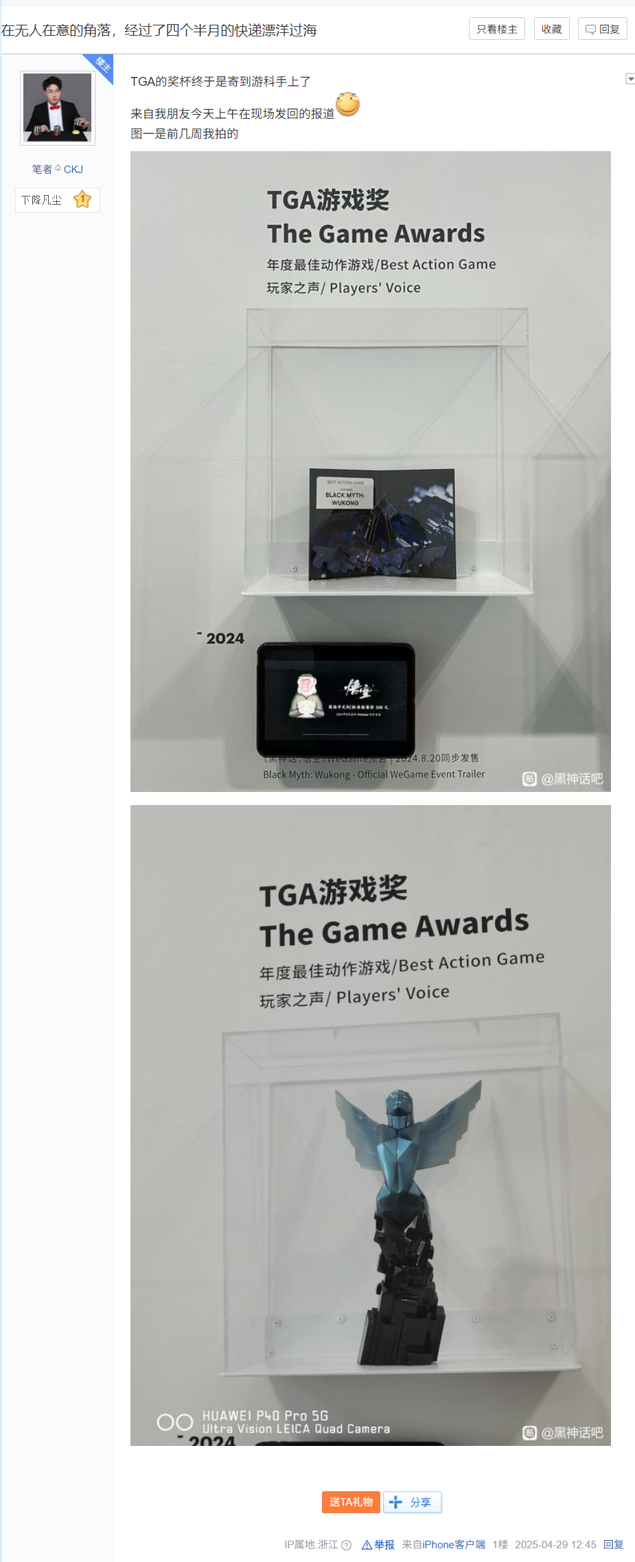 也就是说,《黑神话:悟空》TGA 2024 奖杯花了 4 个多月的时间才寄到游戏科学手中。