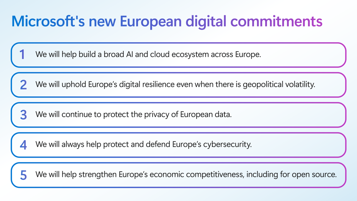微软的承诺还包括维护欧洲数字韧性、继续保护欧洲数据隐私、保护网络安全以及帮助加强欧洲的经济竞争力。