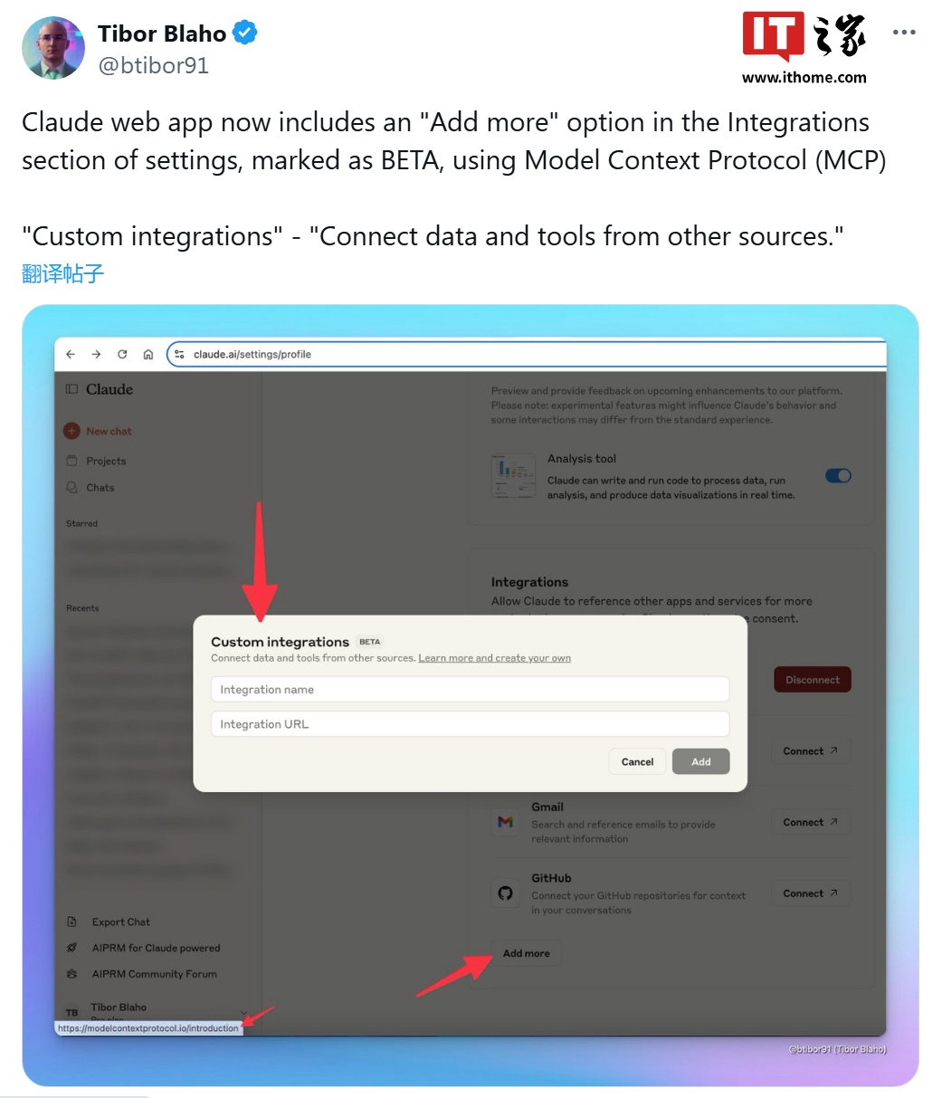 Claude 的集成功能目前仅限于 Drive、Calendar 和 Gmail 等谷歌核心服务,而最新曝光的测试版 UI 新增“添加自定义集成”选项,并附有“了解更多”链接,直接指向 MCP(模块化组件协议)的官方文档。