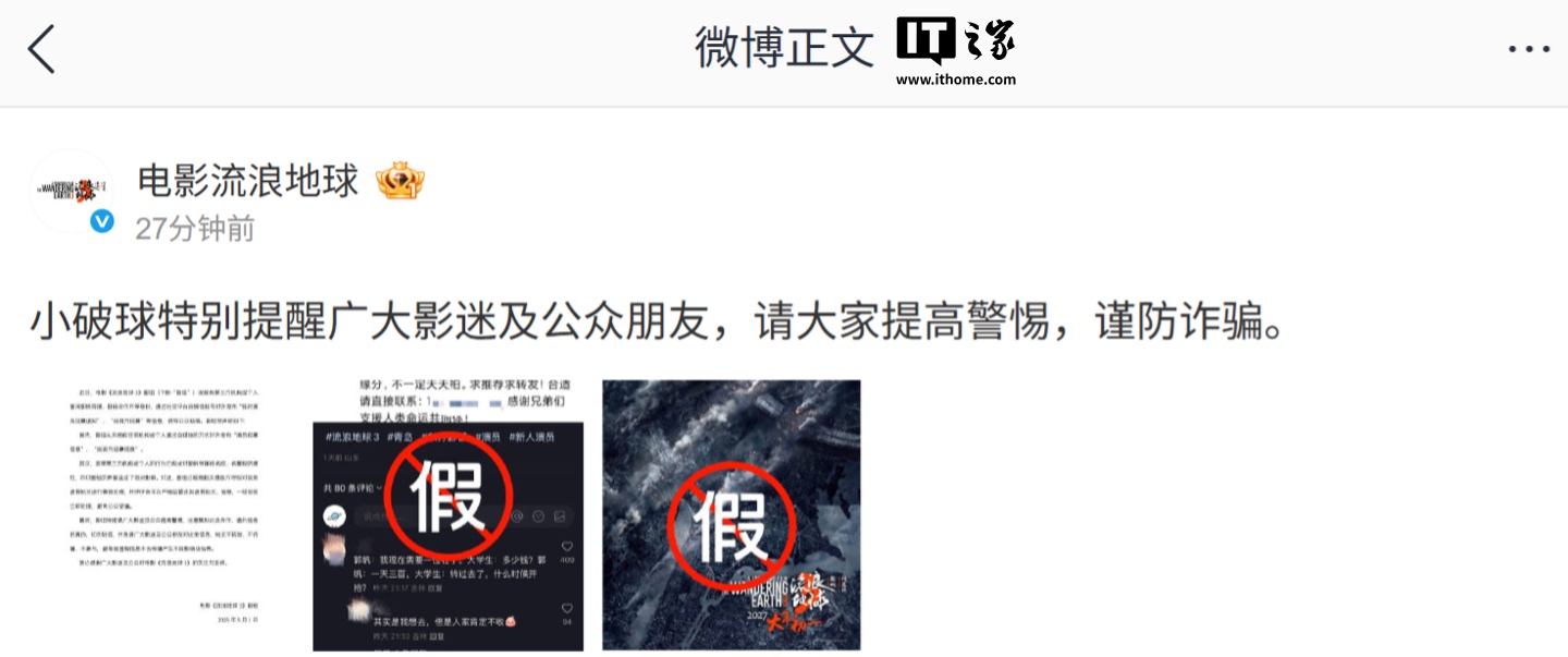 IT之家 5 月 1 日消息,电影《流浪地球》官方微博 @电影流浪地球 今日发文称,有第三方机构或个人冒用郭帆导演、剧组合作方身份对外发布“临时演员招募通知”、“投资方招募”等信息,诱导公众联络。官方提醒影迷及公众朋友,请大家提高警惕,谨防诈骗。