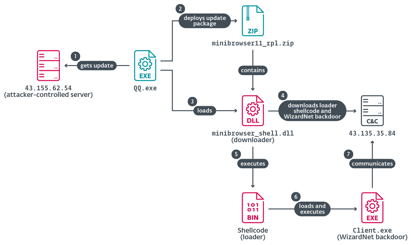 感染后,该工具监控特定域名流量,尤其是腾讯、百度、迅雷、优酷、爱奇艺、金山、芒果 TV、风行、有道、小米、小米 MIUI、PPLive、美图、奇虎 360 和暴风(按照原文排序)等中国软件更新服务器相关的域名。一旦发现连接请求,它会重定向下载恶意更新,安装后门程序“WizardNet”,让攻击者持续控制设备并安装更多恶意软件。