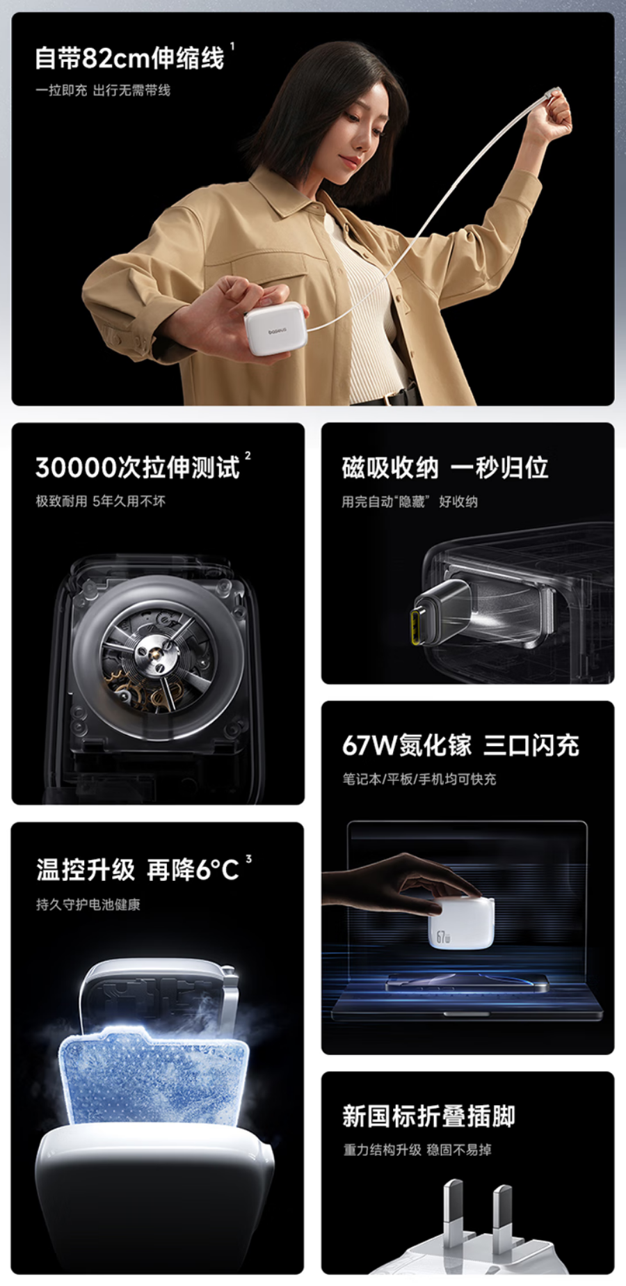 82cm 的线充长度,既避免了短线材频繁弯腰插拔的不便,又杜绝了长线材缠绕打结的困扰;支持 8 段自由调节的设计,让它能灵活适配高铁小桌板充电、机场充电桩、酒店床头柜等高频场景;搭配灵动伸缩的插线、可折叠国标插脚,收纳好的倍思灵动充如小包纸巾大小,机身重量 198g。