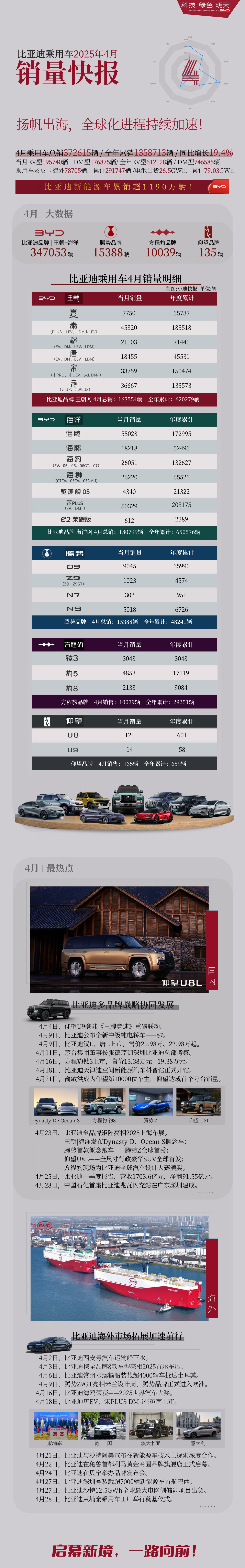IT之家 5 月 1 日消息,在比亚迪官微公布了 4 月销量总数 372615 辆后,博主 @小迪快报 也公布了比亚迪旗下各车型的具体销量情况。