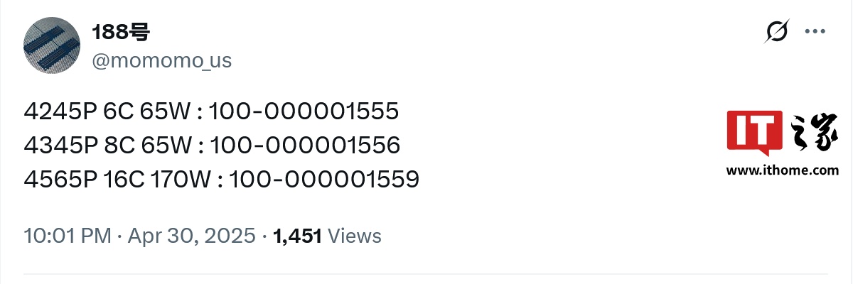 188 号 (@momomo_us) 还分享了三款 EPYC 4005 处理器的具体名称和产品 ID,即 6 核心 45W 的的 EPYC 4245P、8 核心 65W 的 EPYC 4345P、16 核心 170W 的 EPYC 4565P,规格大致对应消费级的锐龙 5 9600X、锐龙 7 9700X、锐龙 9 9950X。