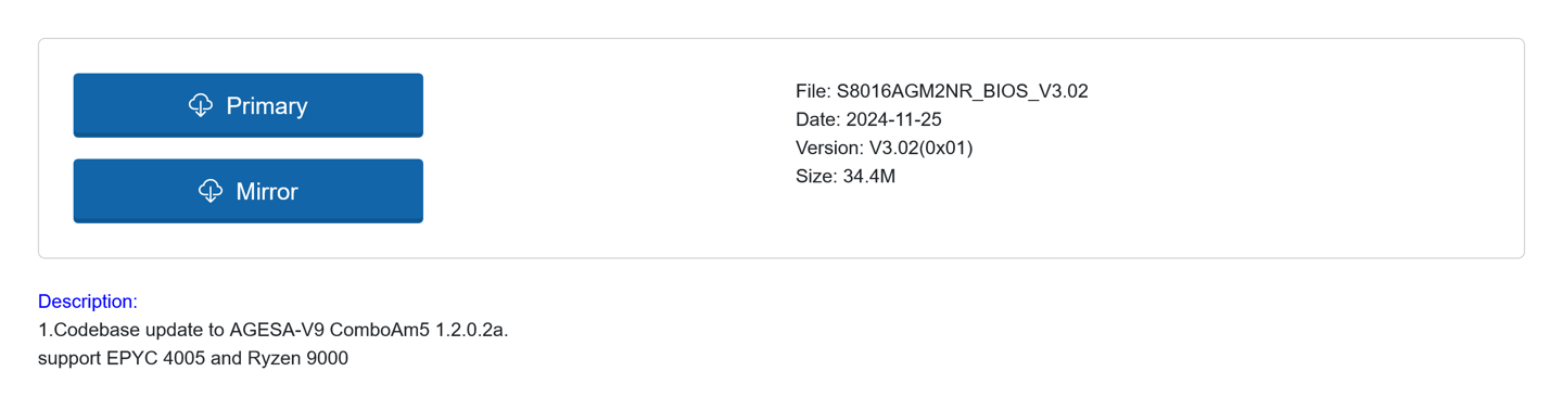 X 平台消息人士 188 号 (@momomo_us) 注意到,服务器厂商神雲科技早在 2024 年 11 月就已向其基于 B650 芯片组的 S8016AGM2NR 主板推送了支持 EPYC 4005 和锐龙 9000 处理器的 BIOS,进一步说明了 "Grado" 和 "Granite Ridge" 的亲缘关系。