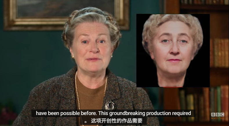 阿加莎于 1976 年去世,其形象通过结合授权图像、有限片段和过去的音频录音进行合成。这些数据与演员 Vivien Keene 混合,Keene 会在视频中“表演”阿加莎,然后替换面部。