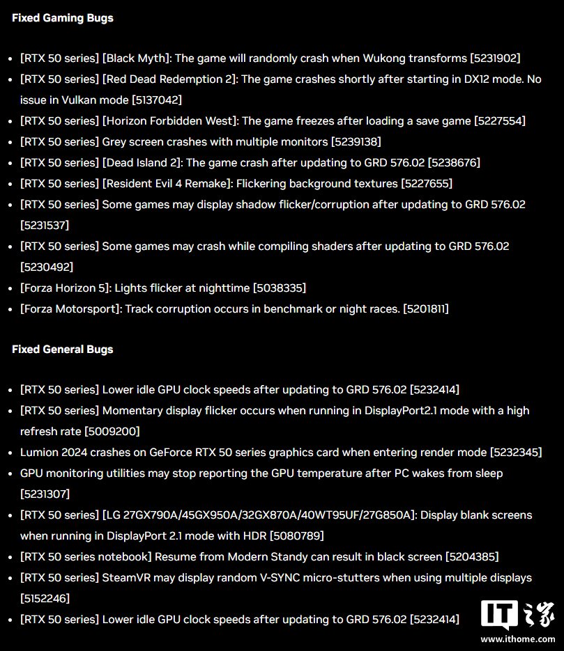 IT之家 5 月 2 日消息,英伟达现已发布 Game Ready 576.28 驱动,根据更新说明,新版驱动修复了许多困扰 RTX 50 系列显卡用户的 Bug,例如在《黑神话:悟空》中一变身就崩溃的问题。