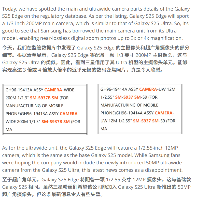 IT之家 5 月 2 日消息,外媒 SammyGuru 4 月 30 日发布消息称,在一份“监管数据库”中发现了 Galaxy S25 Edge 主摄和超广角摄像头的详细参数。