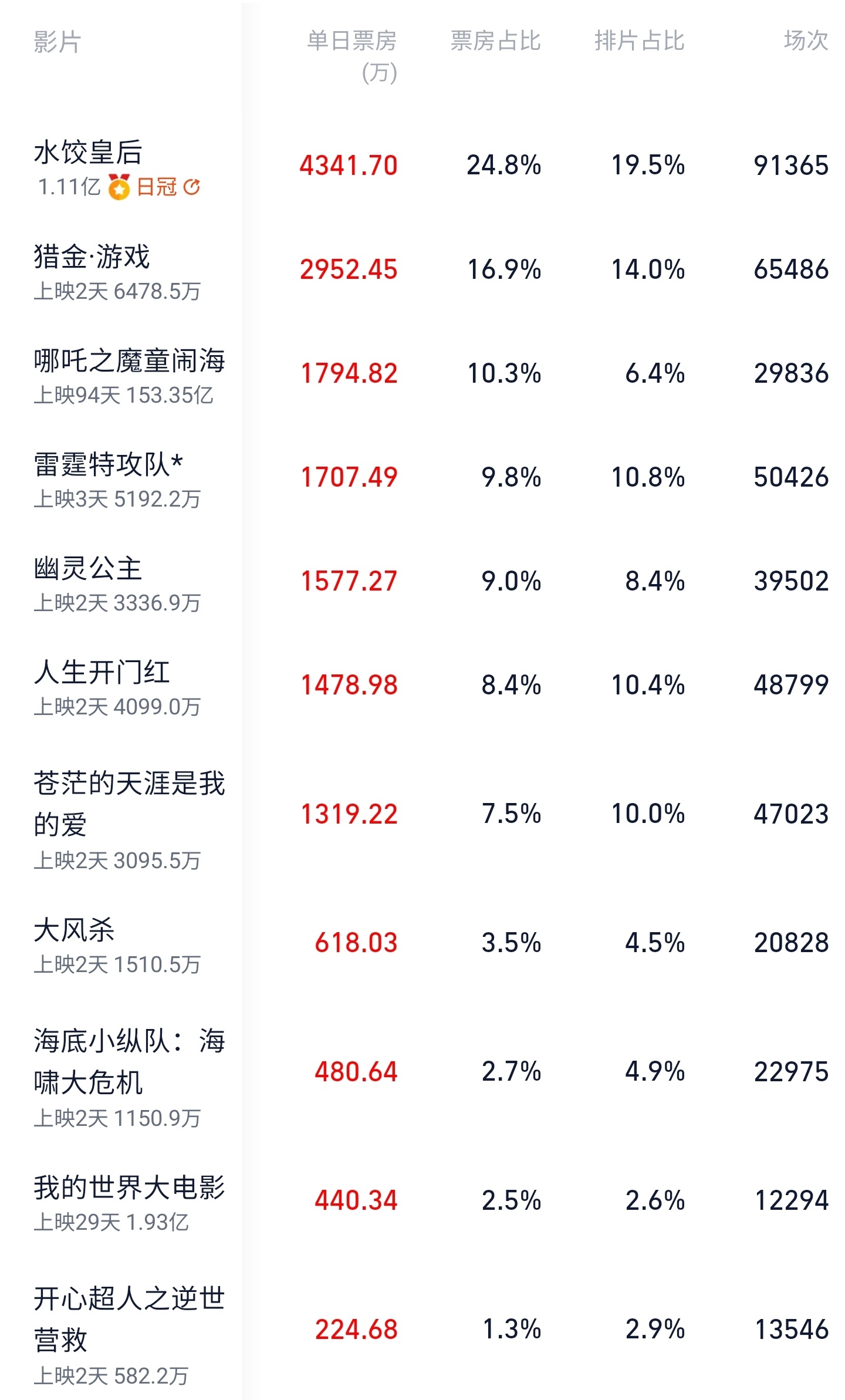 《哪吒之魔童闹海》1794.85 万元(5 月 1 日 1045.73 万元)