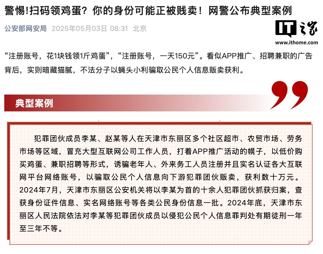 IT之家 5 月 3 日消息,据公安部网安局官方公众号,近期天津市侦破一起个人信息诈骗案件,不法分子打着“注册账号,花 1 块钱领 1 斤鸡蛋”,“注册账号,一天 150 元”旗号,以蝇头小利骗取公民个人信息贩卖获利。
