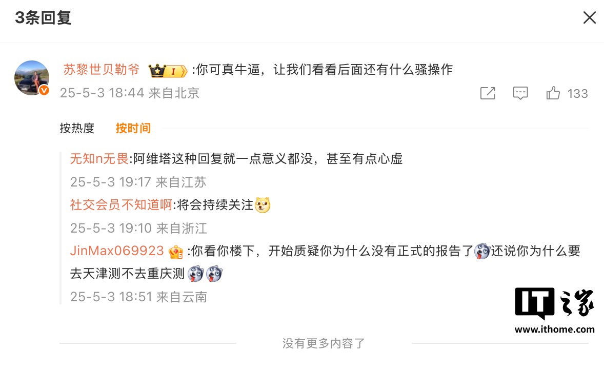 IT之家注意到,相应博主 @苏黎世贝勒爷 在阿维塔科技法务部这一微博下进行了评论,对此“阿维塔科技法务部”尚未对该评论进行回应。