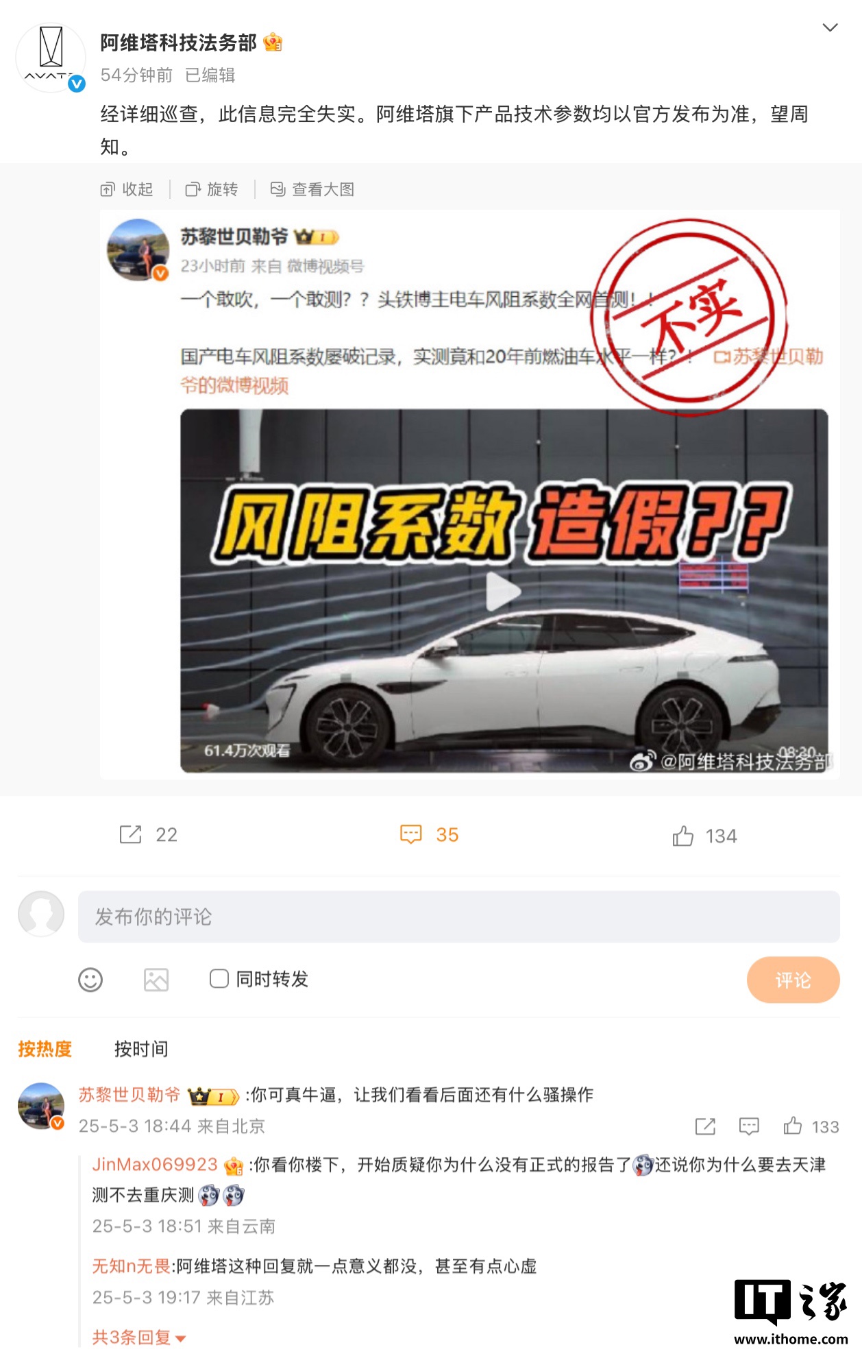 ▲ 相应博主发布的视频对此,“阿维塔科技法务部”官方微博发文,称“经详细巡查,此信息完全失实。阿维塔旗下产品技术参数均以官方发布为准,望周知”。