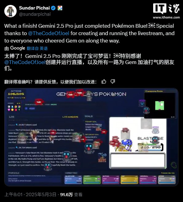 谷歌首席执行官桑达尔・皮查伊(Sundar Pichai)在 X 网站上兴奋地宣布:“太精彩了!Gemini 2.5 Pro 刚刚完成了《宝可梦蓝》!”
