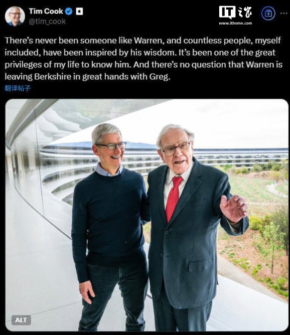 在巴菲特宣布退休消息后,苹果公司 CEO 蒂姆・库克在社交媒体发布了两人合照,并发文致敬。库克在发文中表示:“从来没有人像沃伦这样的人,包括我自己在内的无数人都受到了他智慧的启迪。能认识他是我人生中莫大的荣幸之一。毫无疑问,沃伦把伯克希尔公司交到格雷格手中,是非常明智的选择,公司会得到妥善的管理。”