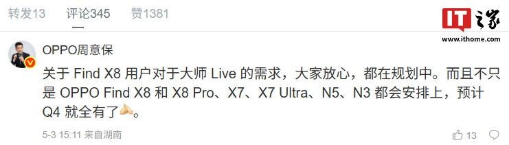 IT之家 5 月 5 日消息,OPPO Find 系列产品负责人周意保本周在微博中透露了大师 Live 功能适配机型。他表示:“不只是 OPPO Find X8 和 X8 Pro、X7、X7 Ultra、N5、N3 都会安排上,预计 Q4 就全有了。”(由此来看,预计适配机型包括 OPPO Find X8 / X7 系列、OPPO Find N5、Find N3 等)