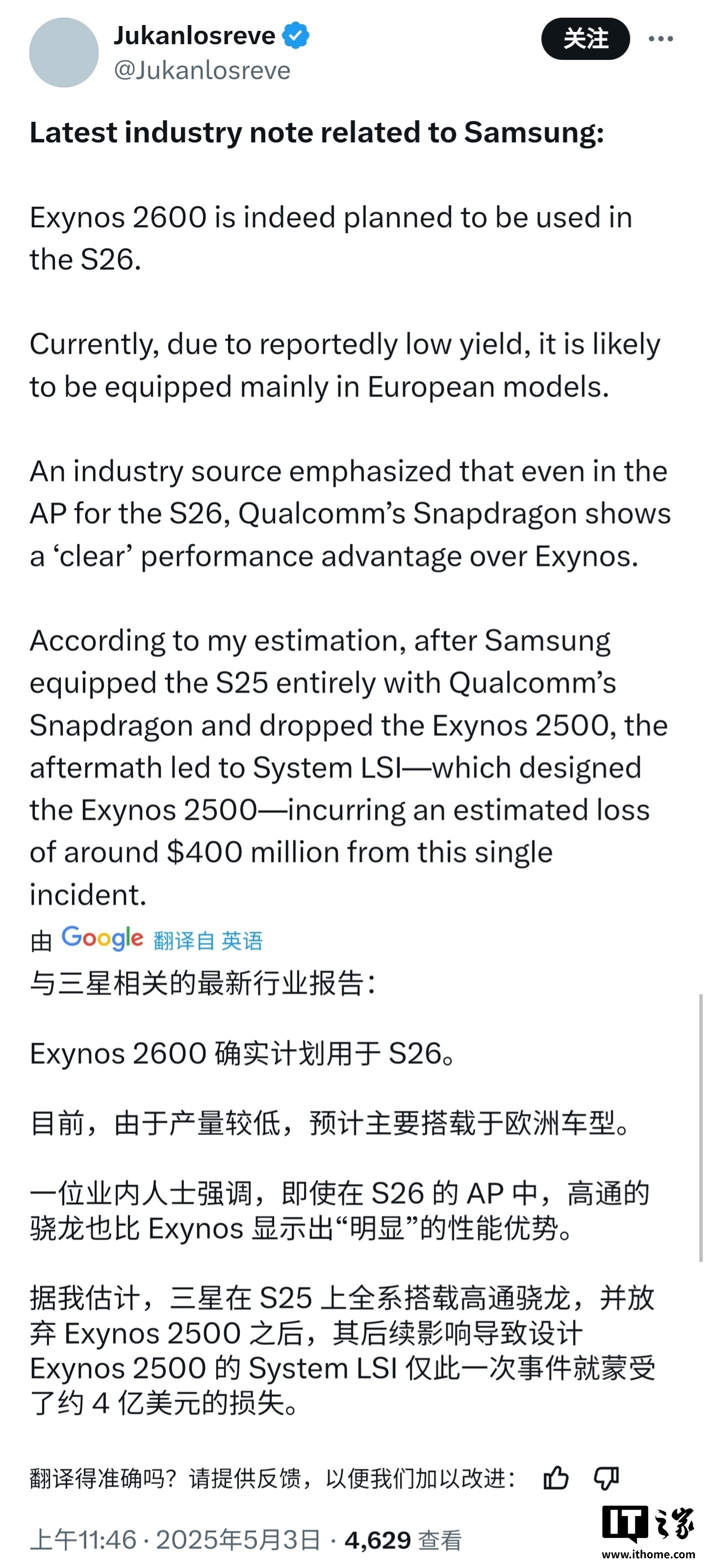 IT之家 5 月 5 日消息,据 X 平台博主 Jukanlosreve 爆料,三星 Galaxy S26 手机确实会搭载 Exynos 2600 处理器,但是主要在欧洲销售。这意味着其他国家和地区的机型,或将继续搭载骁龙处理器。