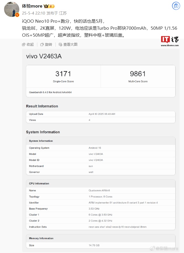 目前,iQOO 官方暂未透露新机具体配置信息。博主 @体验more 昨日发文透露,iQOO Neo10 Pro+ 手机最快 5 月发布,该机搭载骁龙 8 至尊版处理器、配备 2K 直屏、内置 7000mAh 电池(支持 120W 快充)。另外,该机还后置 50MP 1/1.56 OIS + 50MP 超广镜头组合、配备超声波指纹、采用塑料中框 + 玻璃后盖设计。