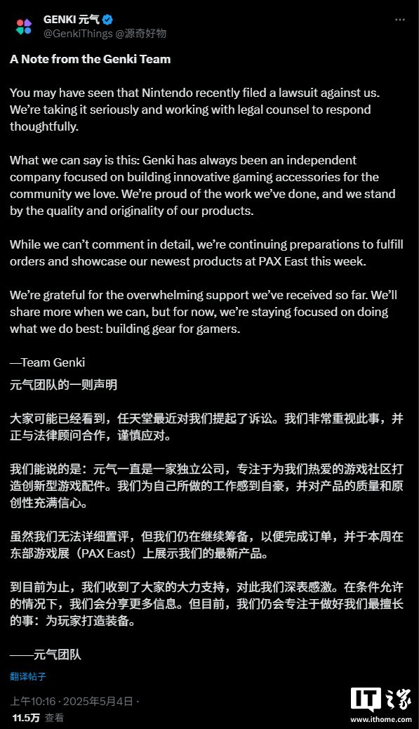随后,任天堂美国公司向加利福尼亚州的美国地区法院对 Genki 提起诉讼。对此,Genki 在 X 上发表了公开回应,承认了被起诉的消息,并表示“我们正在严肃对待此事,并与法律顾问合作,做出深思熟虑的回应。”Genki 还强调,作为一家独立公司,他们专注于开发创新的游戏配件,并为自己的工作感到自豪。不过,Genki 也指出,由于案件仍在进行中,他们无法详细评论,并且目前正在积极准备参加 PAX East 展会。