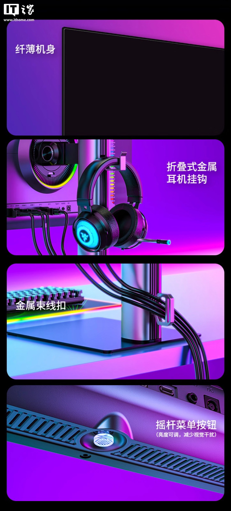 该机支持 PIP / PBP 和 KVM,显示器内置双扬声器、提供 RGB 氛围灯、支持 VESA 75x75mm 壁挂,显示器的支架支持升降 / 倾斜 / 旋转,支架背面提供折叠式金属耳机挂架。