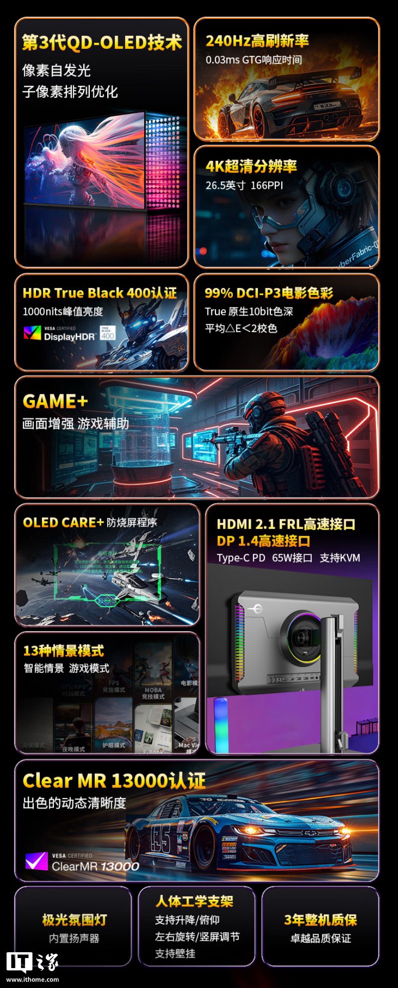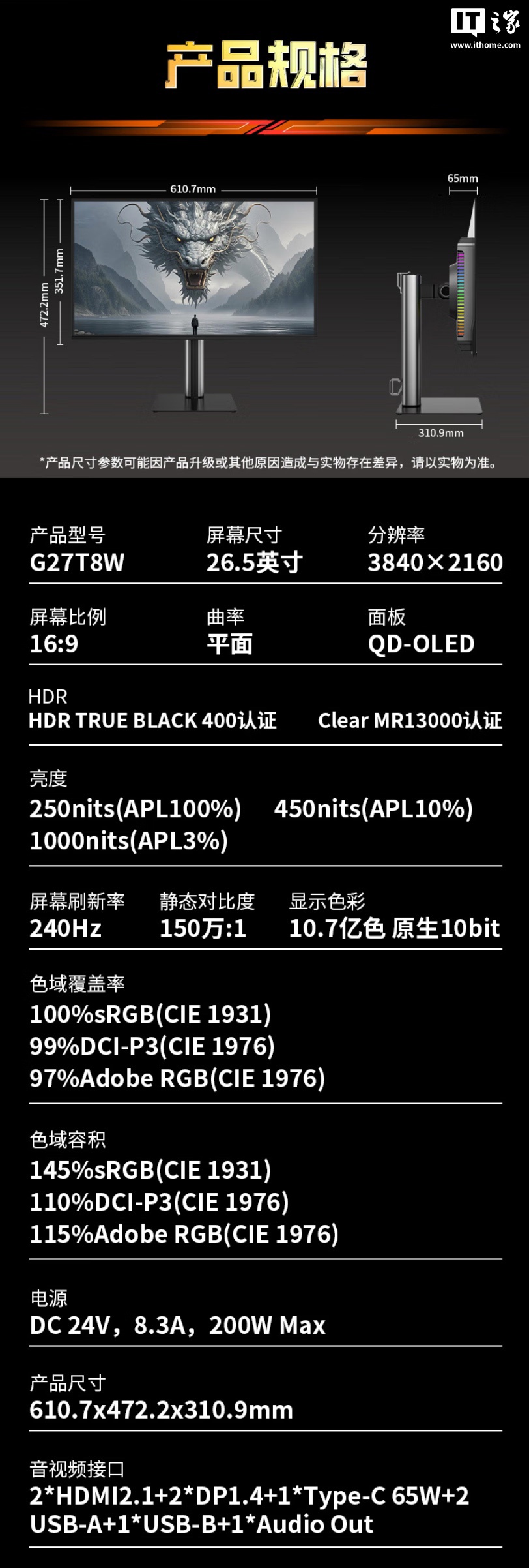 这款显示器配备一块 3840x2160 分辨率 QD-OLED 面板,显示器峰值亮度 1000 尼特,静态对比度 150 万:1,GtG 响应速度 0.03ms,显示器支持原生 10-Bit 色彩,覆盖 100% sRGB、99% DCI-P3、97% Adobe RGB。