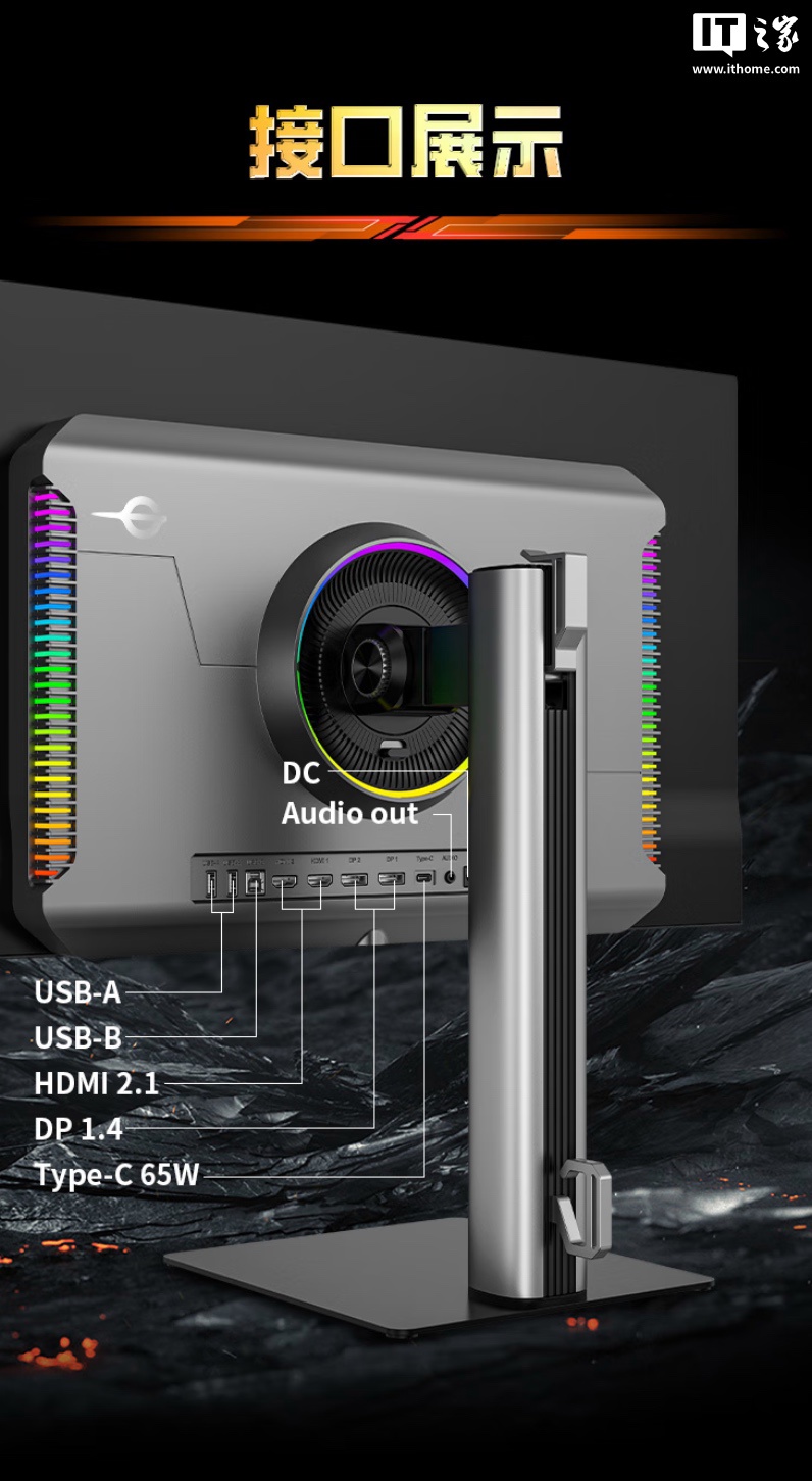 接口方面,该机提供 2 个 HDMI 2.1、2 个 DP 1.4、1 个 USB-C 65W、2 个 USB-A(KVM)、1 个 USB-B(KVM)、1 个 3.5mm 音频接口。