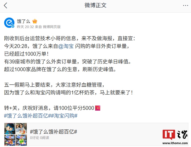 IT之家 5 月 6 日消息,饿了么官方昨日晚发文宣布:当日 20:28,饿了么来自淘宝闪购的单日外卖订单量已经超过 1000 万单。有 39 座城市的饿了么外卖订单量,突破了历史单日峰值。超过 1000 家品牌在饿了么的生意,刷新历史峰值。