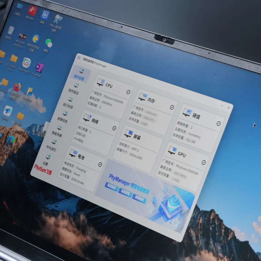 腾锐 D3000M 集成了 8 个飞腾自主研发的 FTC862 CPU 内核,根据实机 PhyManager 电脑管家显示内容应也包含 GPU 单元。该处理器“整体性能达到国内领先、国际一流水平”,在典型办公场景下能实现长达 10 小时的续航能力。