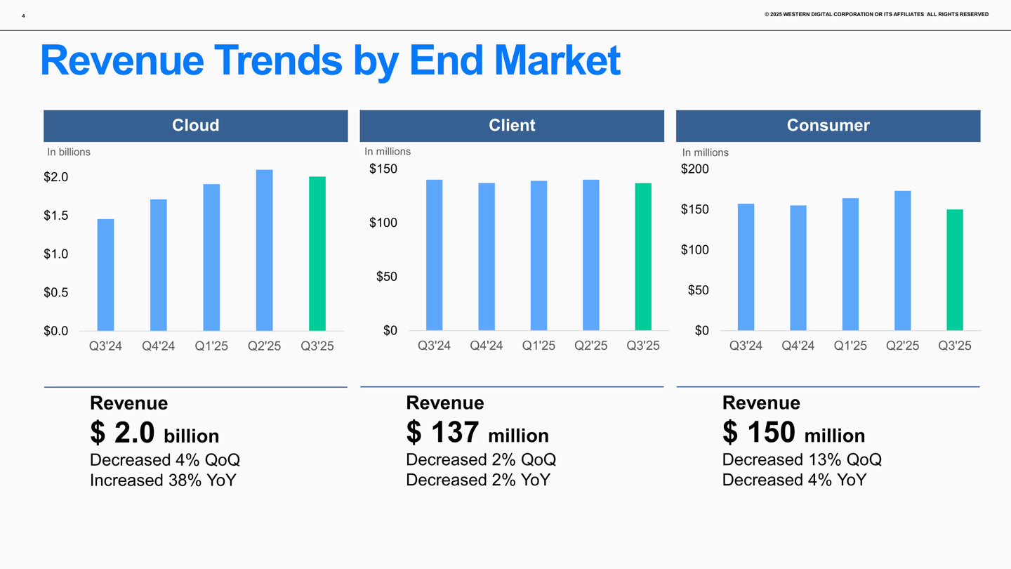 按终端市场划分,云业务贡献 20.07 亿美元营收,环比下降 4%,主要由于近线产品的比特出货量下滑 6%,同时 ASP 单价上涨了 5%;客户端部分实现 1.37 亿美元营收,由于出货下滑环比和同比均下行 2%;消费类贡营收则为 1.5 亿美元,环比下降 13%,这主要受出货量下降影响。