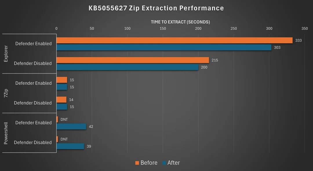 相比之下,文件资源管理器的性能与 7Zip 或 PowerShell 的 Expand-Archive 命令相比,依然“慢得离谱”。用户批评微软虽新增了对 RAR 和 7Z 格式的支持,但这些功能只是“拼凑”在老旧系统上,实用性有限。