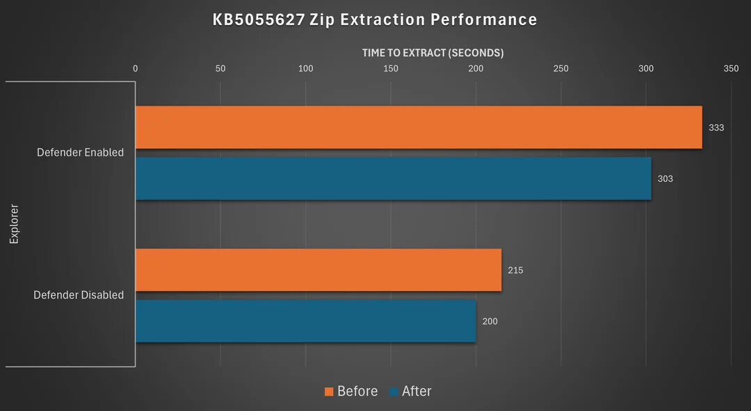 用户 IridiumIO(同时也是 CompactGUI 开发者)指出,Windows Defender 的实时保护(Realtime Protection)严重拖慢速度,关闭后解压速度可提升 35%。