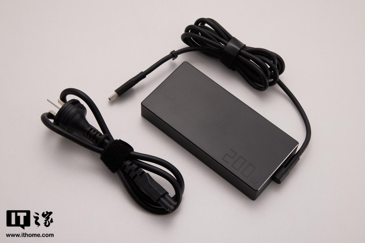 配件方面,包装里配备了一个方形黑色的 200W 的电源适配器,接口为定制方形。D 壳部分三分之二面积覆盖着规整的长条形进风口,上下各有一条凸起的黑色防滑脚垫,底部两侧还有一组独立的低音扬声器开口。