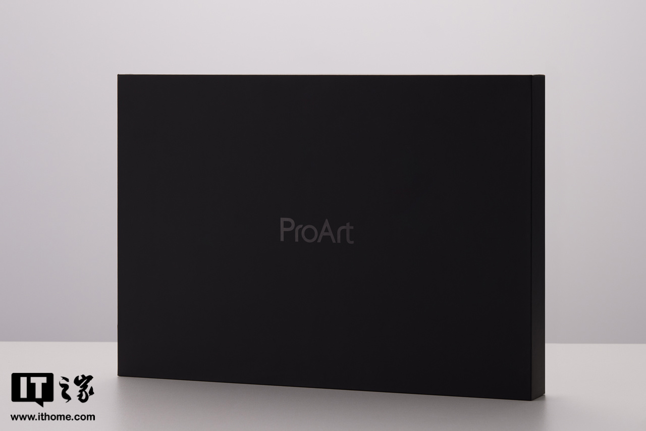 ProArt 创 16 2025 延续了上代黑色扁平包装,包装盒正面中间印有特别字体设计的 ProArt Logo,光从包装上就能感受到产品的轻薄属性。