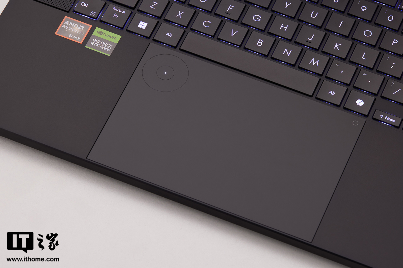 ProArt 创 16 2025 触控板面积较大,上下几乎贴着键盘和底部边缘,玻璃材质手感细腻,全域按压反馈清脆。