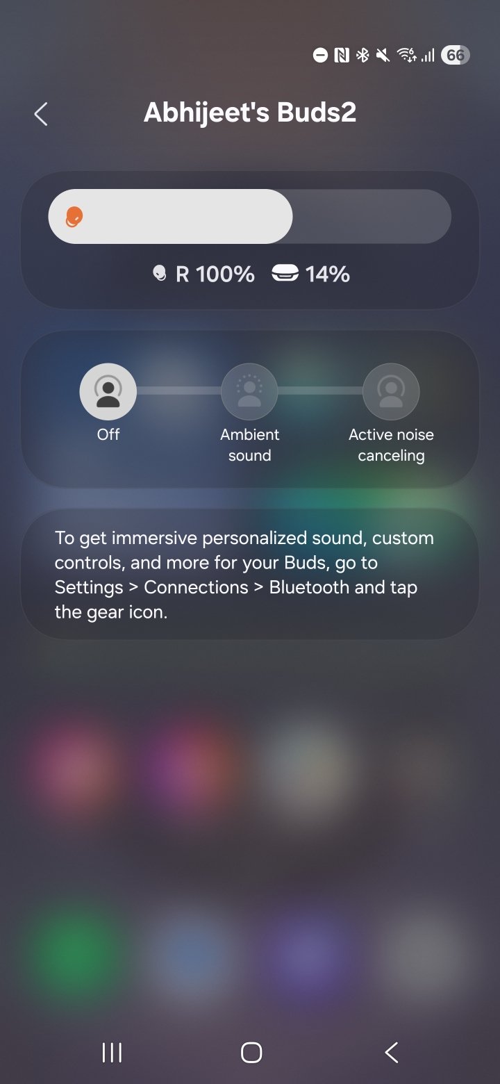 用户长按音量滑块即可弹出菜单,快速调节音量、环境音和降噪等设置。此外,One UI 8 在 UI 设计上也更为精致,弹出菜单采用玻璃般的背景模糊效果。不过可能因为该版本尚未完成,当前版本暂不支持 360 音频和均衡器等功能调整。