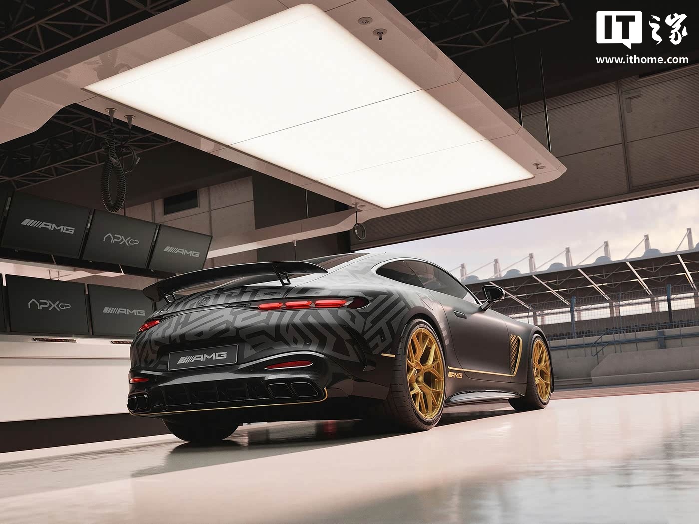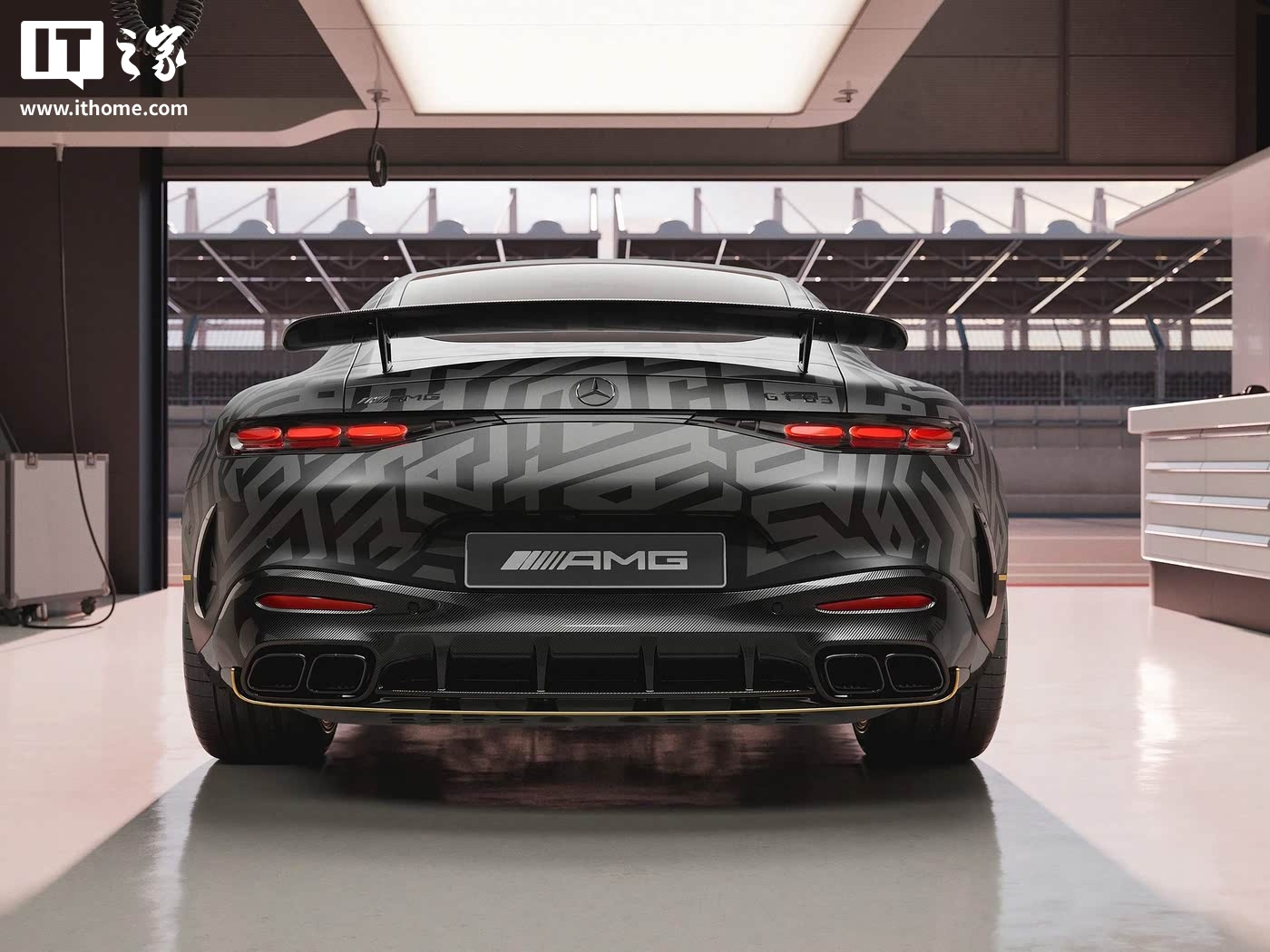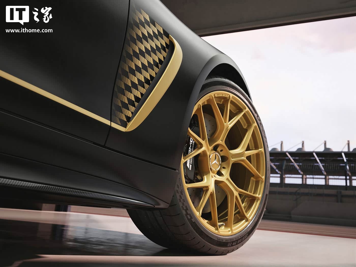 据IT之家了解,AMG GT APXGP 限量版车型基于 AMG GT 63 4MATIC + 打造,选装了 AMG Night Package II 外饰套件,整体采用黑色哑光涂装,展现出极致的运动感与神秘感。车辆的 AMG 盾徽和奔驰标志均采用黑色镀铬装饰,进一步强化了其低调而奢华的气质。此外,该车还配备了 APXGP 车队专属的拉花设计,包括格栅框架、前翼子板(方格旗设计拉花)、侧裙板、后裙板和扩散器等部位均采用金色装饰,与黑色车身形成鲜明对比,彰显其独特的身份。21 英寸锻造轮圈搭配黑色涂装卡钳,进一步提升了车辆的视觉冲击力。