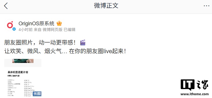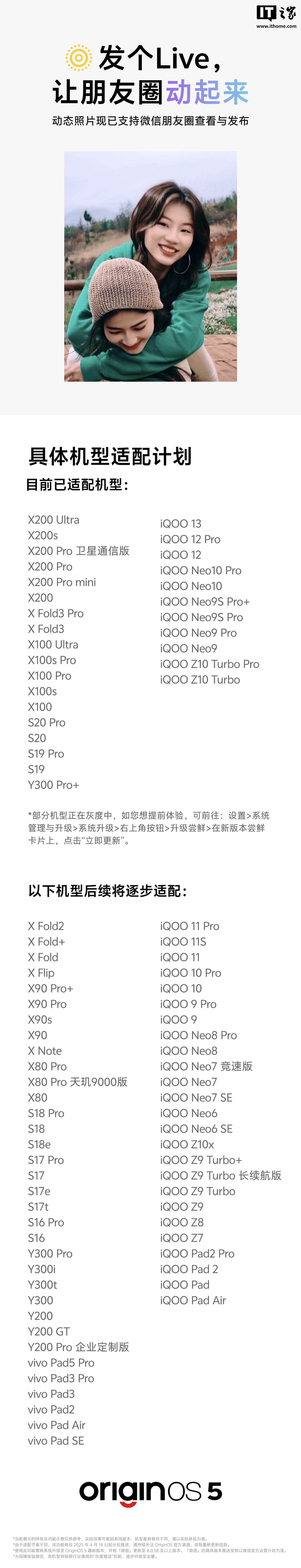 IT之家 5 月 6 日消息,vivo 手机操作系统官方微博 @OriginOS原系统 今日公布了微信朋友圈 Live 图适配机型,含 vivo X200 系列、iQOO 13/12 等机型。