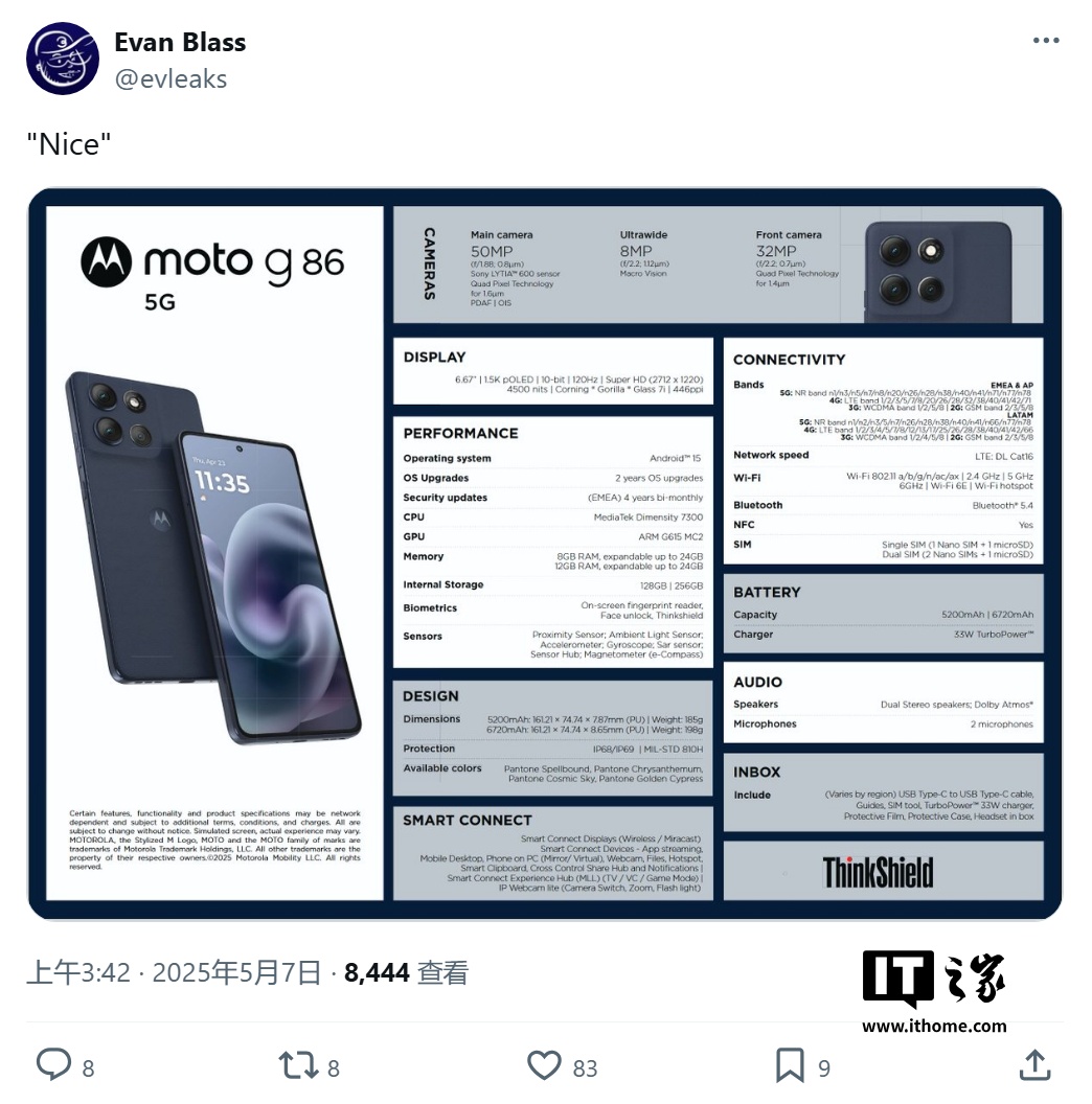 IT之家 5 月 7 日消息,在昨日曝光 Moto G56 5G 手机之后,消息源 Evan Blass(@Evleaks)今天(5 月 7 日)在 X 平台再次发布推文,分享了摩托罗拉 Moto G86 5G 手机的关键规格和渲染图。
