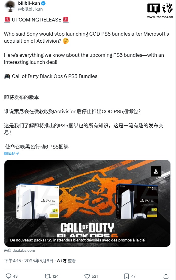 爆料者 @billbil_kun 昨日表示,索尼已经与微软达成协议,将推出一款全新的《使命召唤:黑色行动 6》PS5 捆绑包。
