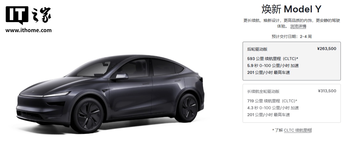 作为参考,国内焕新 Model Y 只有 26.35 万元的后轮驱动版、31.35 万元的长续航全轮驱动版,暂未提供长续航后轮驱动版。