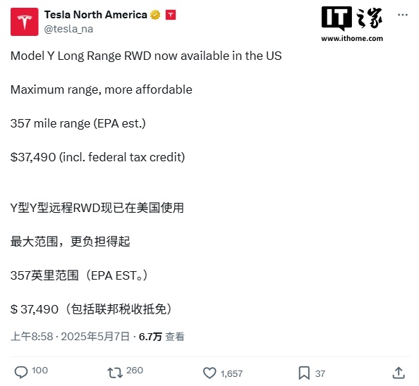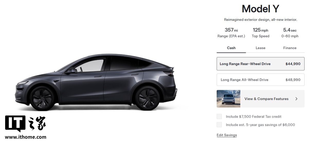 IT之家 5 月 7 日消息,特斯拉宣布在美国新增长续航后轮驱动版 Model Y 车型,官方指导价 44990 美元(IT之家注:现汇率约合 32.4 万元人民币),叠加 7500 美元税收抵免后 37490 美元(现汇率约合 27 万元人民币)。